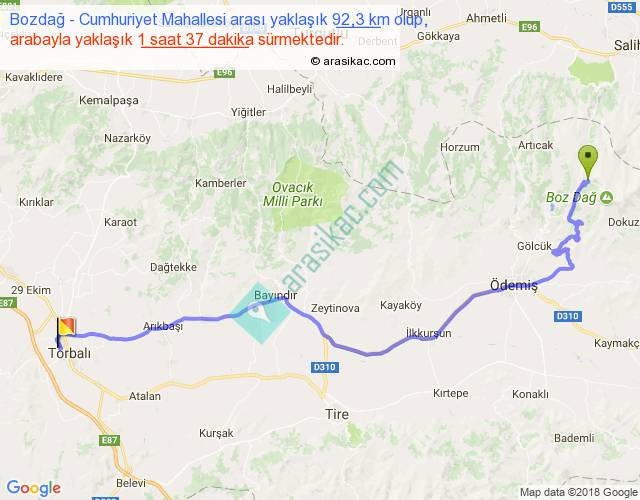 Bozdağ - Cumhuriyet Mahallesi arası yaklaşık olarak 90 km/h ile yukarıda belirtilen sürede olup, iki yerin kuş uçuşu uzaklığı (mesafesi) 66'dir. Yolculuk otobüsle 2 saat 6 dakika sürmektedir.