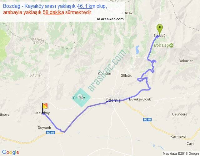 Bozdağ - Kayaköy arası yaklaşık olarak 90 km/h ile yukarıda belirtilen sürede olup, iki yerin kuş uçuşu uzaklığı (mesafesi) 27'dir. Yolculuk otobüsle 1 saat 15 dakika sürmektedir.