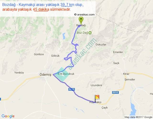 Bozdağ - Kaymakçi arası yaklaşık olarak 90 km/h ile yukarıda belirtilen sürede olup, iki yerin kuş uçuşu uzaklığı (mesafesi) 20'dir. Yolculuk otobüsle 58 dakika sürmektedir.