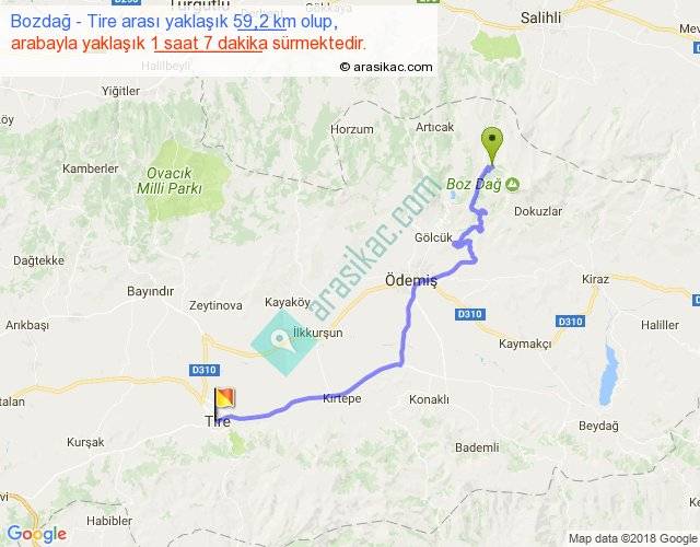 Bozdağ - Tire arası yaklaşık olarak 90 km/h ile yukarıda belirtilen sürede olup, iki yerin kuş uçuşu uzaklığı (mesafesi) 41'dir. Yolculuk otobüsle 1 saat 27 dakika sürmektedir.