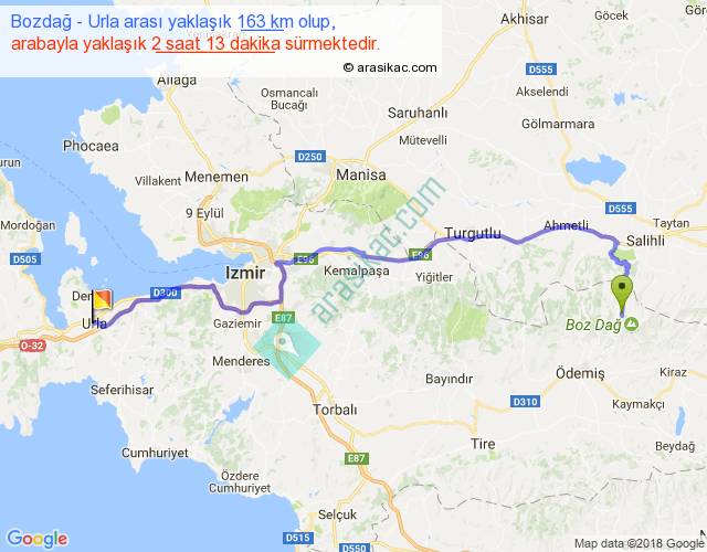 Bozdağ - Urla arası yaklaşık olarak 90 km/h ile yukarıda belirtilen sürede olup, iki yerin kuş uçuşu uzaklığı (mesafesi) 114'dir. Yolculuk otobüsle 2 saat 52 dakika sürmektedir.
