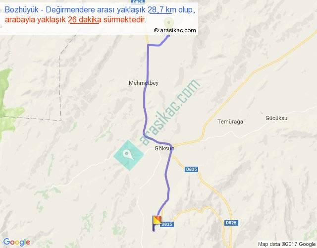 Bozhüyük - Değirmendere arası yaklaşık olarak 90 km/h ile yukarıda belirtilen sürede olup, iki yerin kuş uçuşu uzaklığı (mesafesi) 24'dir. Yolculuk otobüsle 33 dakika sürmektedir.