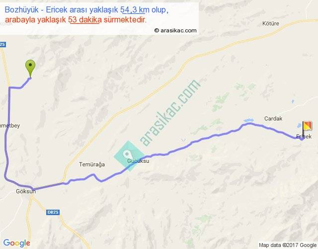 Bozhüyük - Ericek arası yaklaşık olarak 90 km/h ile yukarıda belirtilen sürede olup, iki yerin kuş uçuşu uzaklığı (mesafesi) 34'dir. Yolculuk otobüsle 1 saat 8 dakika sürmektedir.