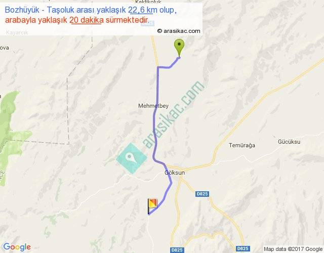 Bozhüyük - Taşoluk arası yaklaşık olarak 90 km/h ile yukarıda belirtilen sürede olup, iki yerin kuş uçuşu uzaklığı (mesafesi) 19'dir. Yolculuk otobüsle 26 dakika sürmektedir.