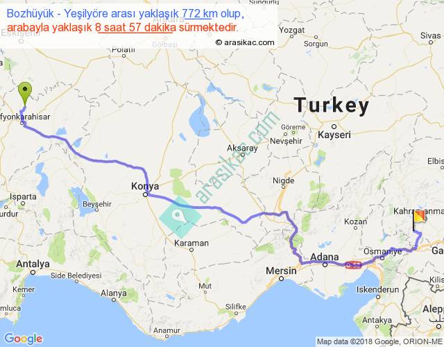Bozhüyük - Yeşilyöre arası yaklaşık olarak 90 km/h ile yukarıda belirtilen sürede olup, iki yerin kuş uçuşu uzaklığı (mesafesi) 562'dir. Eğer belirtilen yerler arasında uçak seferi var ise bu süre uçakla 51 dakika'ya kadar düşebilir. Yolculuk otobüsle 11 saat 38 dakika sürmektedir.