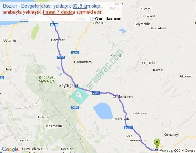 Bozkır - Beyşehir arası yaklaşık olarak 90 km/h ile yukarıda belirtilen sürede olup, iki yerin kuş uçuşu uzaklığı (mesafesi) 71'dir. Yolculuk otobüsle 1 saat 27 dakika sürmektedir.
