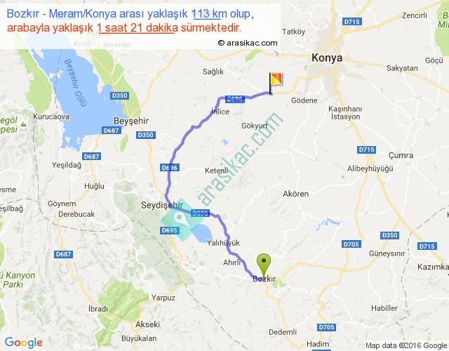 Bozkır - Meram Konya arası yaklaşık olarak 90 km/h ile yukarıda belirtilen sürede olup, iki yerin kuş uçuşu uzaklığı (mesafesi) 63'dir. Yolculuk otobüsle 1 saat 45 dakika sürmektedir.