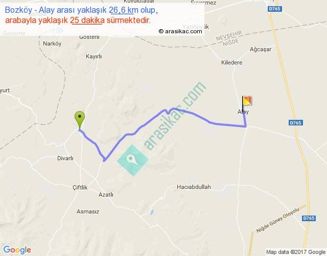 Bozköy - Alay arası yaklaşık olarak 90 km/h ile yukarıda belirtilen sürede olup, iki yerin kuş uçuşu uzaklığı (mesafesi) 19'dir. Yolculuk otobüsle 32 dakika sürmektedir.