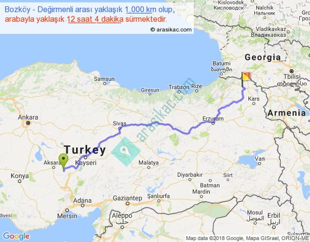 Bozköy - Değirmenli arası yaklaşık olarak 90 km/h ile yukarıda belirtilen sürede olup, iki yerin kuş uçuşu uzaklığı (mesafesi) 762'dir. Eğer belirtilen yerler arasında uçak seferi var ise bu süre uçakla 1 saat 10 dakika'ya kadar düşebilir. Yolculuk otobüsle 15 saat 41 dakika sürmektedir.