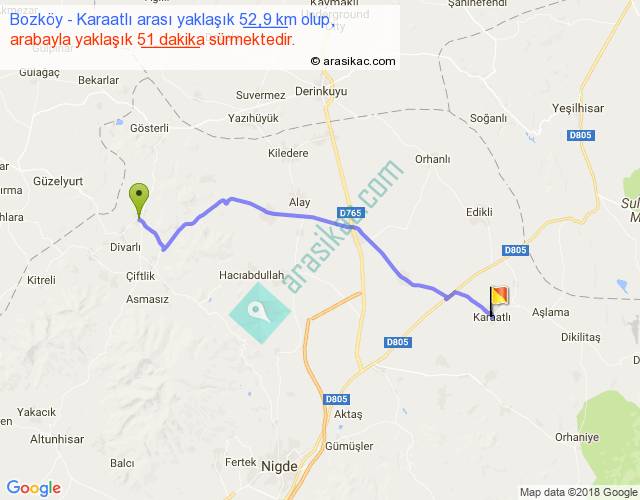 Bozköy - Karaatlı arası yaklaşık olarak 90 km/h ile yukarıda belirtilen sürede olup, iki yerin kuş uçuşu uzaklığı (mesafesi) 44'dir. Yolculuk otobüsle 1 saat 6 dakika sürmektedir.