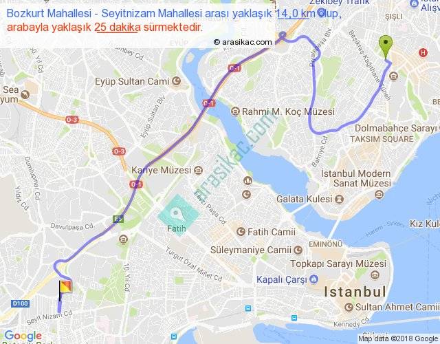 Bozkurt Mahallesi - Seyitnizam Mahallesi arası yaklaşık olarak 90 km/h ile yukarıda belirtilen sürede olup, iki yerin kuş uçuşu uzaklığı (mesafesi) 8'dir. Yolculuk otobüsle 32 dakika sürmektedir.