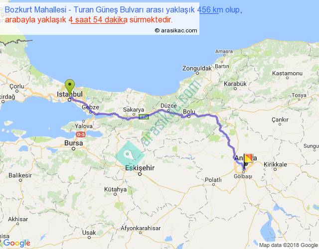 Bozkurt Mahallesi - Turan Güneş Bulvarı arası yaklaşık olarak 90 km/h ile yukarıda belirtilen sürede olup, iki yerin kuş uçuşu uzaklığı (mesafesi) 350'dir. Eğer belirtilen yerler arasında uçak seferi var ise bu süre uçakla 32 dakika'ya kadar düşebilir. Yolculuk otobüsle 6 saat 22 dakika sürmektedir.