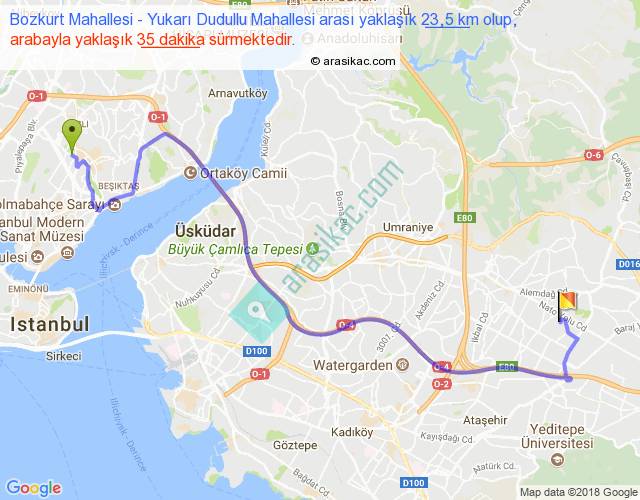 Bozkurt Mahallesi - Yukarı Dudullu Mahallesi arası yaklaşık olarak 90 km/h ile yukarıda belirtilen sürede olup, iki yerin kuş uçuşu uzaklığı (mesafesi) 15'dir. Yolculuk otobüsle 45 dakika sürmektedir.