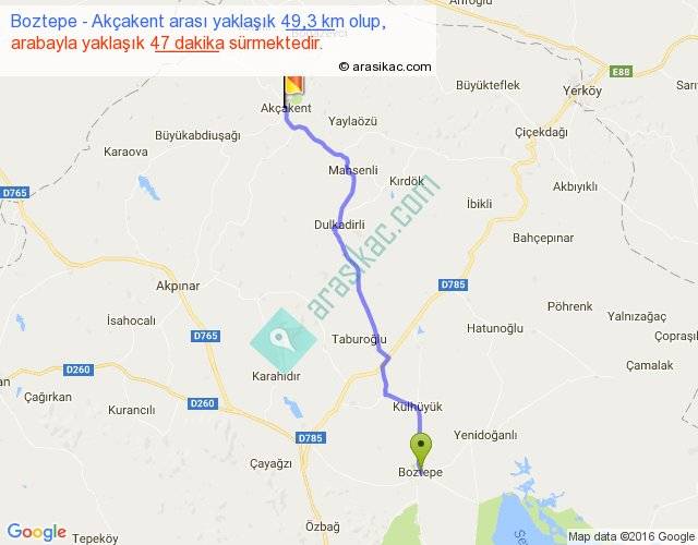 Boztepe - Akçakent arası yaklaşık olarak 90 km/h ile yukarıda belirtilen sürede olup, iki yerin kuş uçuşu uzaklığı (mesafesi) 42'dir. Yolculuk otobüsle 1 saat 1 dakika sürmektedir.