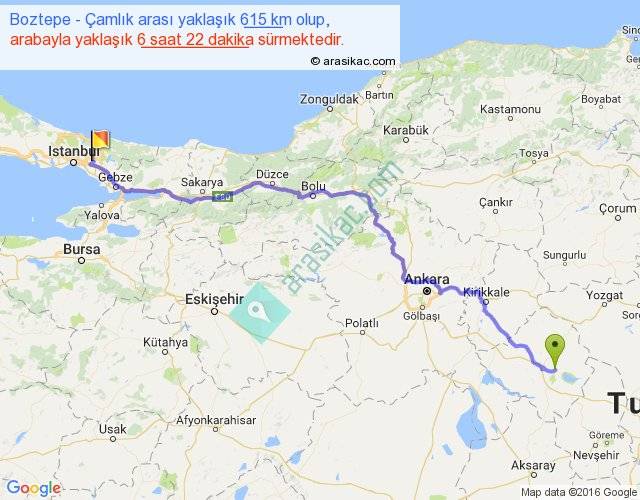 Boztepe - Çamlık arası yaklaşık olarak 90 km/h ile yukarıda belirtilen sürede olup, iki yerin kuş uçuşu uzaklığı (mesafesi) 470'dir. Eğer belirtilen yerler arasında uçak seferi var ise bu süre uçakla 43 dakika'ya kadar düşebilir. Yolculuk otobüsle 8 saat 16 dakika sürmektedir.