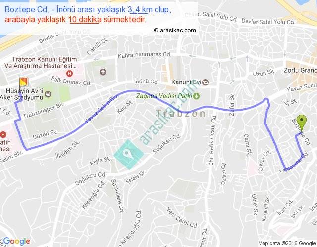 Boztepe Cd. - İnönü arası yaklaşık olarak 90 km/h ile yukarıda belirtilen sürede olup, iki yerin kuş uçuşu uzaklığı (mesafesi) 2'dir. Yolculuk otobüsle 13 dakika sürmektedir.
