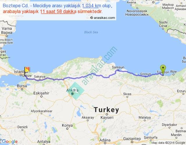 Boztepe Cd. - Mecidiye arası yaklaşık olarak 90 km/h ile yukarıda belirtilen sürede olup, iki yerin kuş uçuşu uzaklığı (mesafesi) 870'dir. Eğer belirtilen yerler arasında uçak seferi var ise bu süre uçakla 1 saat 20 dakika'ya kadar düşebilir. Yolculuk otobüsle 15 saat 33 dakika sürmektedir.