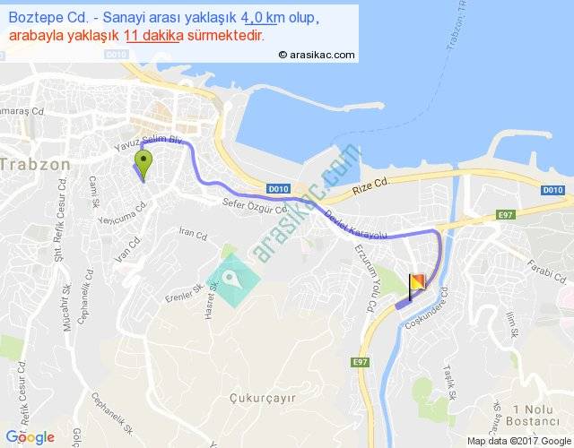 Boztepe Cd. - Sanayi arası yaklaşık olarak 90 km/h ile yukarıda belirtilen sürede olup, iki yerin kuş uçuşu uzaklığı (mesafesi) 2'dir. Yolculuk otobüsle 14 dakika sürmektedir.