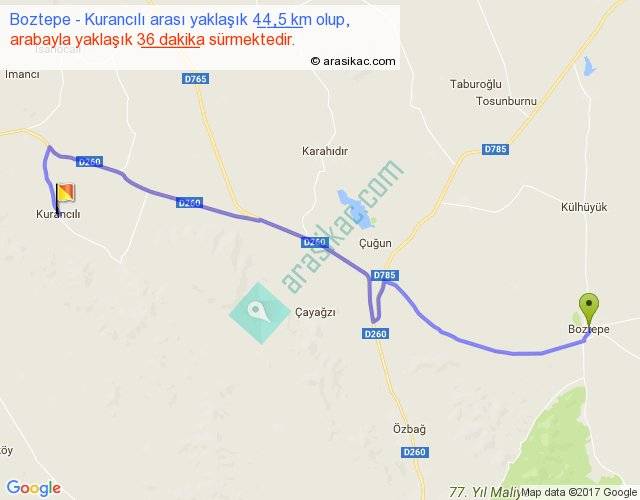 Boztepe - Kurancılı arası yaklaşık olarak 90 km/h ile yukarıda belirtilen sürede olup, iki yerin kuş uçuşu uzaklığı (mesafesi) 32'dir. Yolculuk otobüsle 46 dakika sürmektedir.