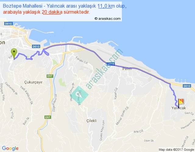 Boztepe Mahallesi - Yalıncak arası yaklaşık olarak 90 km/h ile yukarıda belirtilen sürede olup, iki yerin kuş uçuşu uzaklığı (mesafesi) 8'dir. Yolculuk otobüsle 26 dakika sürmektedir.