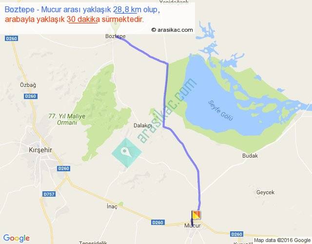 Boztepe - Mucur arası yaklaşık olarak 90 km/h ile yukarıda belirtilen sürede olup, iki yerin kuş uçuşu uzaklığı (mesafesi) 25'dir. Yolculuk otobüsle 39 dakika sürmektedir.