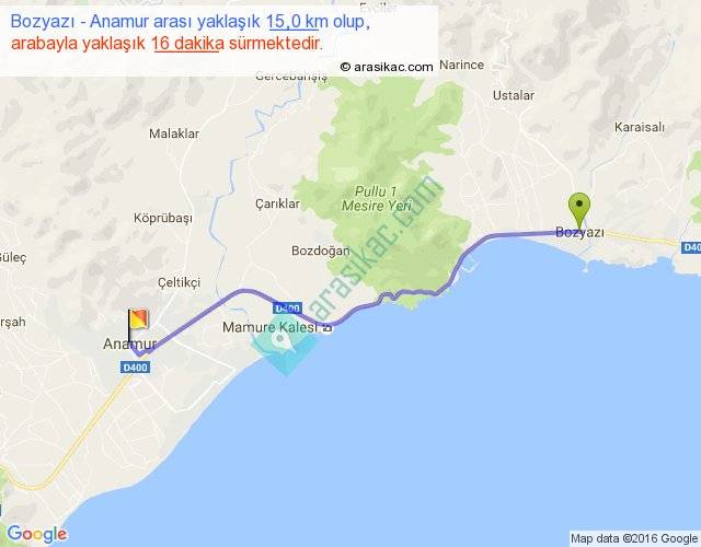 Bozyazı - Anamur arası yaklaşık olarak 90 km/h ile yukarıda belirtilen sürede olup, iki yerin kuş uçuşu uzaklığı (mesafesi) 13'dir. Yolculuk otobüsle 20 dakika sürmektedir.