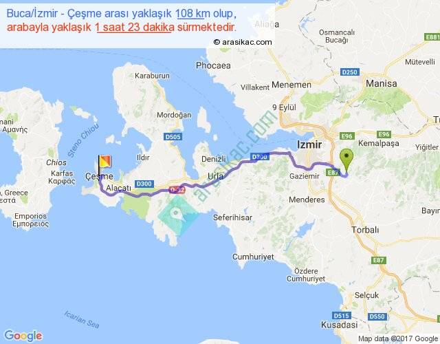 Buca İzmir - Çeşme arası yaklaşık olarak 90 km/h ile yukarıda belirtilen sürede olup, iki yerin kuş uçuşu uzaklığı (mesafesi) 86'dir. Yolculuk otobüsle 1 saat 38 dakika sürmektedir.