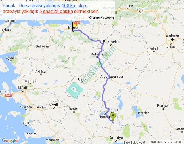 Bucak - Bursa arası yaklaşık olarak 90 km/h ile yukarıda belirtilen sürede olup, iki yerin kuş uçuşu uzaklığı (mesafesi) 329'dir. Eğer belirtilen yerler arasında uçak seferi var ise bu süre uçakla 30 dakika'ya kadar düşebilir. Yolculuk otobüsle 7 saat 9 dakika sürmektedir.