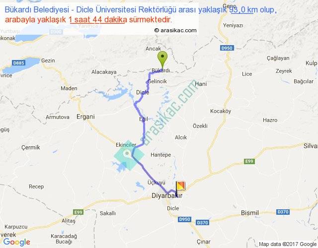Bükardı Belediyesi - Dicle Üniversitesi Rektörlüğü arası yaklaşık olarak 90 km/h ile yukarıda belirtilen sürede olup, iki yerin kuş uçuşu uzaklığı (mesafesi) 62'dir. Yolculuk otobüsle 2 saat 15 dakika sürmektedir.
