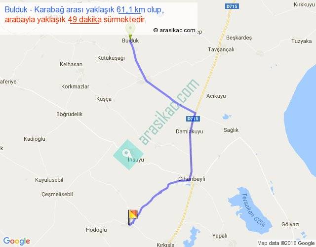 Bulduk - Karabağ arası yaklaşık olarak 90 km/h ile yukarıda belirtilen sürede olup, iki yerin kuş uçuşu uzaklığı (mesafesi) 44'dir. Yolculuk otobüsle 1 saat 3 dakika sürmektedir.