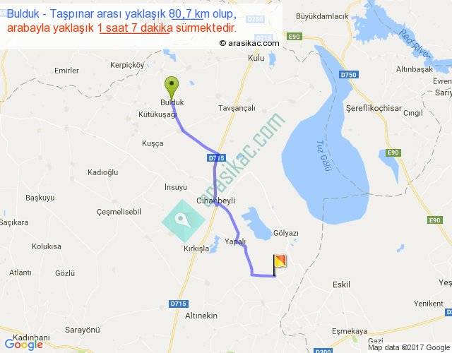 Bulduk - Taşpınar arası yaklaşık olarak 90 km/h ile yukarıda belirtilen sürede olup, iki yerin kuş uçuşu uzaklığı (mesafesi) 68'dir. Yolculuk otobüsle 1 saat 27 dakika sürmektedir.