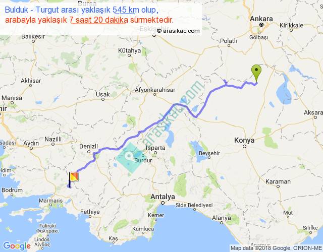 Bulduk - Turgut arası yaklaşık olarak 90 km/h ile yukarıda belirtilen sürede olup, iki yerin kuş uçuşu uzaklığı (mesafesi) 405'dir. Eğer belirtilen yerler arasında uçak seferi var ise bu süre uçakla 37 dakika'ya kadar düşebilir. Yolculuk otobüsle 9 saat 32 dakika sürmektedir.