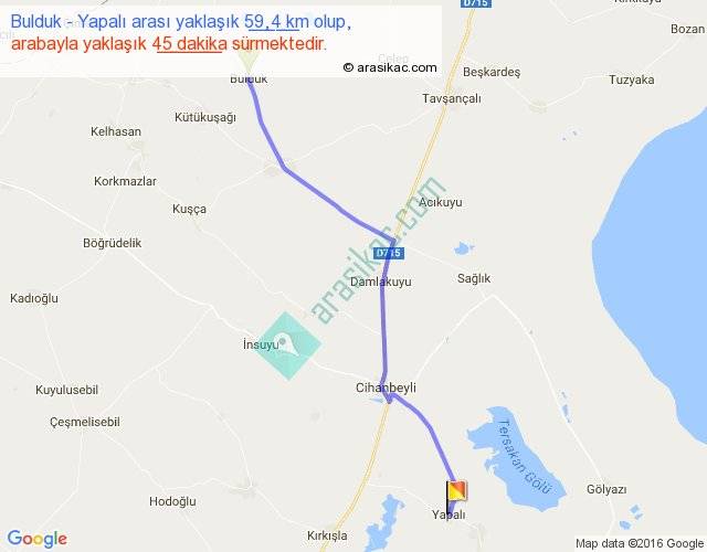 Bulduk - Yapalı arası yaklaşık olarak 90 km/h ile yukarıda belirtilen sürede olup, iki yerin kuş uçuşu uzaklığı (mesafesi) 51'dir. Yolculuk otobüsle 58 dakika sürmektedir.