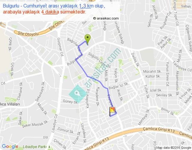 Bulgurlu - Cumhuriyet arası yaklaşık olarak 90 km/h ile yukarıda belirtilen sürede olup, iki yerin kuş uçuşu uzaklığı (mesafesi) 1'dir. Yolculuk otobüsle 5 dakika sürmektedir.