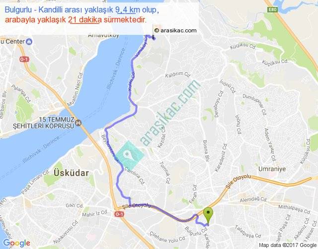 Bulgurlu - Kandilli arası yaklaşık olarak 90 km/h ile yukarıda belirtilen sürede olup, iki yerin kuş uçuşu uzaklığı (mesafesi) 6'dir. Yolculuk otobüsle 27 dakika sürmektedir.