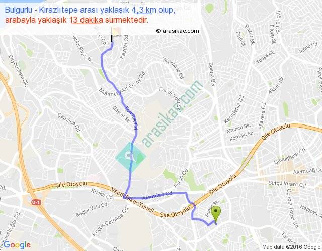 Bulgurlu - Kirazlıtepe arası yaklaşık olarak 90 km/h ile yukarıda belirtilen sürede olup, iki yerin kuş uçuşu uzaklığı (mesafesi) 3'dir. Yolculuk otobüsle 16 dakika sürmektedir.