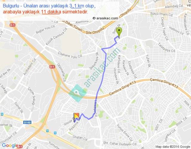 Bulgurlu - Ünalan arası yaklaşık olarak 90 km/h ile yukarıda belirtilen sürede olup, iki yerin kuş uçuşu uzaklığı (mesafesi) 2'dir. Yolculuk otobüsle 14 dakika sürmektedir.