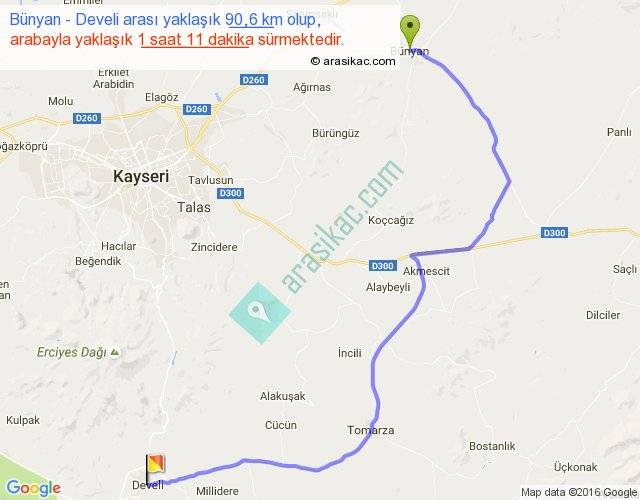 Bünyan - Develi arası yaklaşık olarak 90 km/h ile yukarıda belirtilen sürede olup, iki yerin kuş uçuşu uzaklığı (mesafesi) 60'dir. Yolculuk otobüsle 1 saat 32 dakika sürmektedir.