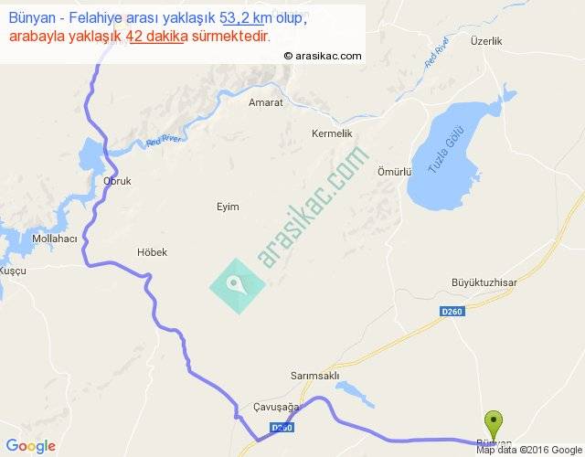 Bünyan - Felahiye arası yaklaşık olarak 90 km/h ile yukarıda belirtilen sürede olup, iki yerin kuş uçuşu uzaklığı (mesafesi) 36'dir. Yolculuk otobüsle 54 dakika sürmektedir.