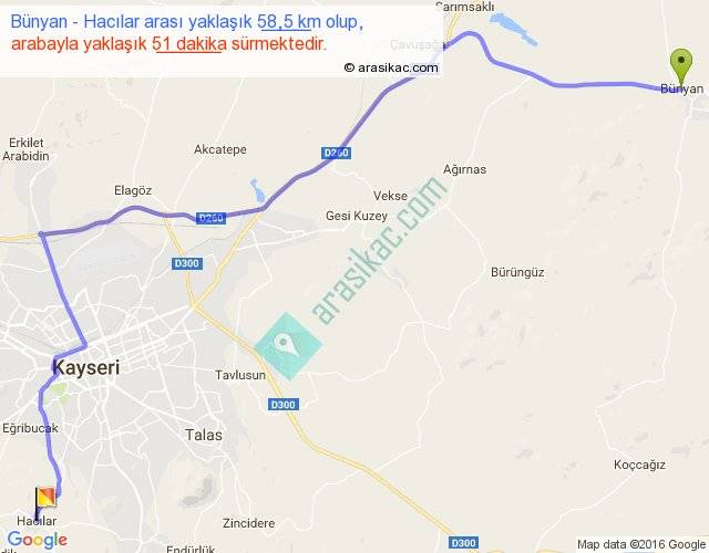 Bünyan - Hacılar arası yaklaşık olarak 90 km/h ile yukarıda belirtilen sürede olup, iki yerin kuş uçuşu uzaklığı (mesafesi) 41'dir. Yolculuk otobüsle 1 saat 6 dakika sürmektedir.