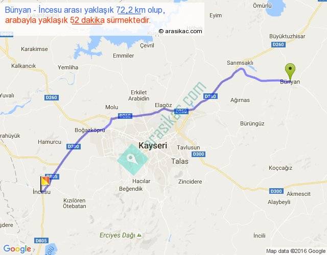 Bünyan - İncesu arası yaklaşık olarak 90 km/h ile yukarıda belirtilen sürede olup, iki yerin kuş uçuşu uzaklığı (mesafesi) 63'dir. Yolculuk otobüsle 1 saat 7 dakika sürmektedir.