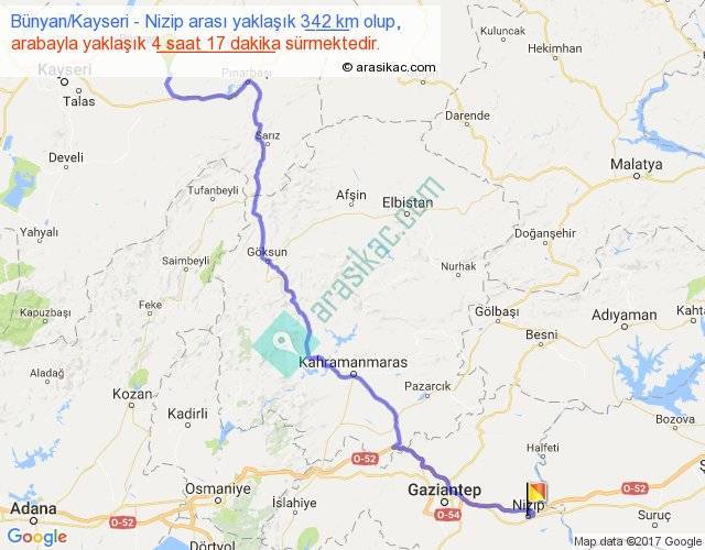 Bünyan Kayseri - Nizip arası yaklaşık olarak 90 km/h ile yukarıda belirtilen sürede olup, iki yerin kuş uçuşu uzaklığı (mesafesi) 248'dir. Yolculuk otobüsle 5 saat 34 dakika sürmektedir.