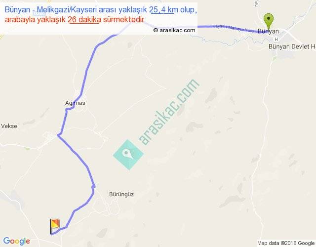Bünyan - Melikgazi Kayseri arası yaklaşık olarak 90 km/h ile yukarıda belirtilen sürede olup, iki yerin kuş uçuşu uzaklığı (mesafesi) 18'dir. Yolculuk otobüsle 33 dakika sürmektedir.