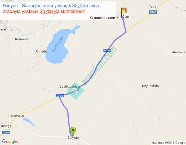 Bünyan - Sarıoğlan arası yaklaşık olarak 90 km/h ile yukarıda belirtilen sürede olup, iki yerin kuş uçuşu uzaklığı (mesafesi) 27'dir. Yolculuk otobüsle 29 dakika sürmektedir.