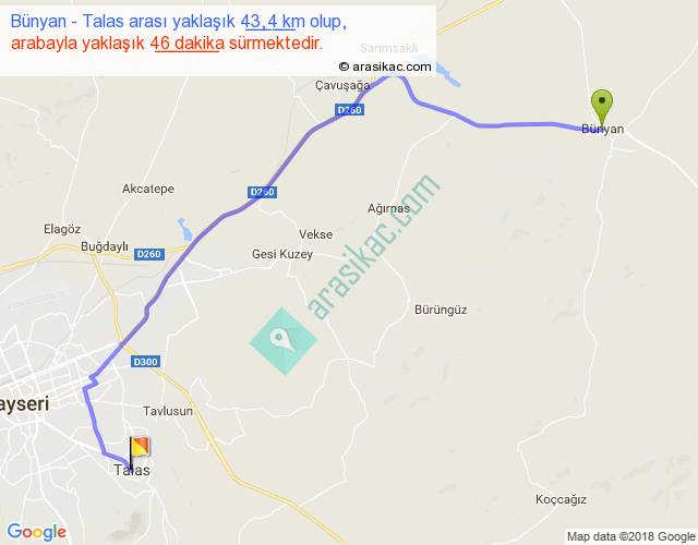 Bünyan - Talas arası yaklaşık olarak 90 km/h ile yukarıda belirtilen sürede olup, iki yerin kuş uçuşu uzaklığı (mesafesi) 32'dir. Yolculuk otobüsle 57 dakika sürmektedir.
