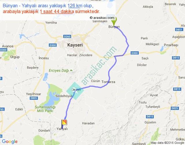 Bünyan - Yahyalı arası yaklaşık olarak 90 km/h ile yukarıda belirtilen sürede olup, iki yerin kuş uçuşu uzaklığı (mesafesi) 94'dir. Yolculuk otobüsle 2 saat 15 dakika sürmektedir.