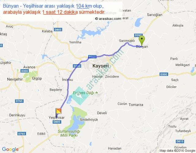 Bünyan - Yeşilhisar arası yaklaşık olarak 90 km/h ile yukarıda belirtilen sürede olup, iki yerin kuş uçuşu uzaklığı (mesafesi) 86'dir. Yolculuk otobüsle 1 saat 33 dakika sürmektedir.