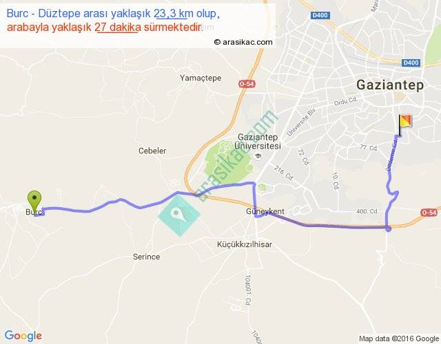 Burc - Düztepe arası yaklaşık olarak 90 km/h ile yukarıda belirtilen sürede olup, iki yerin kuş uçuşu uzaklığı (mesafesi) 16'dir. Yolculuk otobüsle 35 dakika sürmektedir.