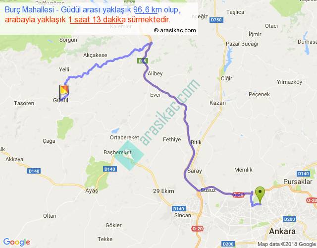 Burç Mahallesi - Güdül arası yaklaşık olarak 90 km/h ile yukarıda belirtilen sürede olup, iki yerin kuş uçuşu uzaklığı (mesafesi) 53'dir. Yolculuk otobüsle 1 saat 34 dakika sürmektedir.