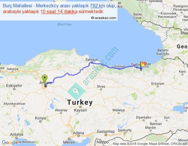 Burç Mahallesi - Merkezköy arası yaklaşık olarak 90 km/h ile yukarıda belirtilen sürede olup, iki yerin kuş uçuşu uzaklığı (mesafesi) 614'dir. Eğer belirtilen yerler arasında uçak seferi var ise bu süre uçakla 56 dakika'ya kadar düşebilir. Yolculuk otobüsle 13 saat 18 dakika sürmektedir.